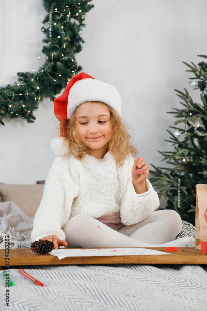 Toddler girl wearing Santa hat writes a letter to Santa, sitting cozy by Christmas tree in a white sweater and festive holiday setting. Advent calendar task