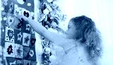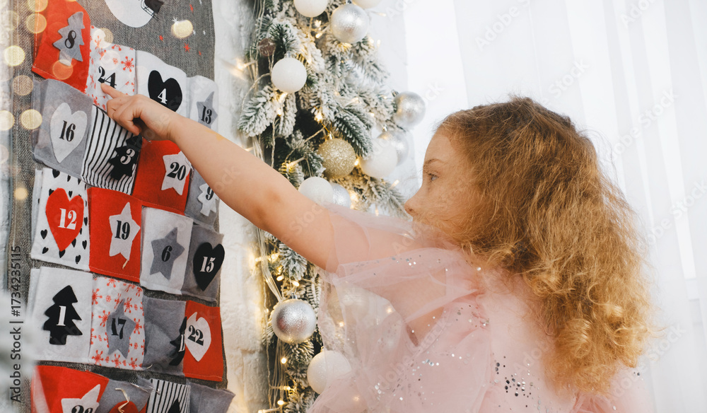 Young girl in a pink dress reaches to open a pocket on her Christmas advent calendar next to decorated tree and twinkling lights
