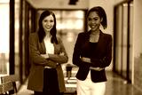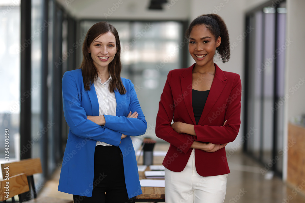 Businesswoman smiling with arms crossed in office. Two confident businesswomen in a modern office, arms crossed, wearing colorful suit, showing teamwork and success.
