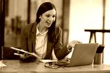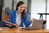 Businesswoman taking notes while having video call on laptop in office. Confident woman smiling during video call in modern office, taking notes. Professionalism and dedication in remote work era.