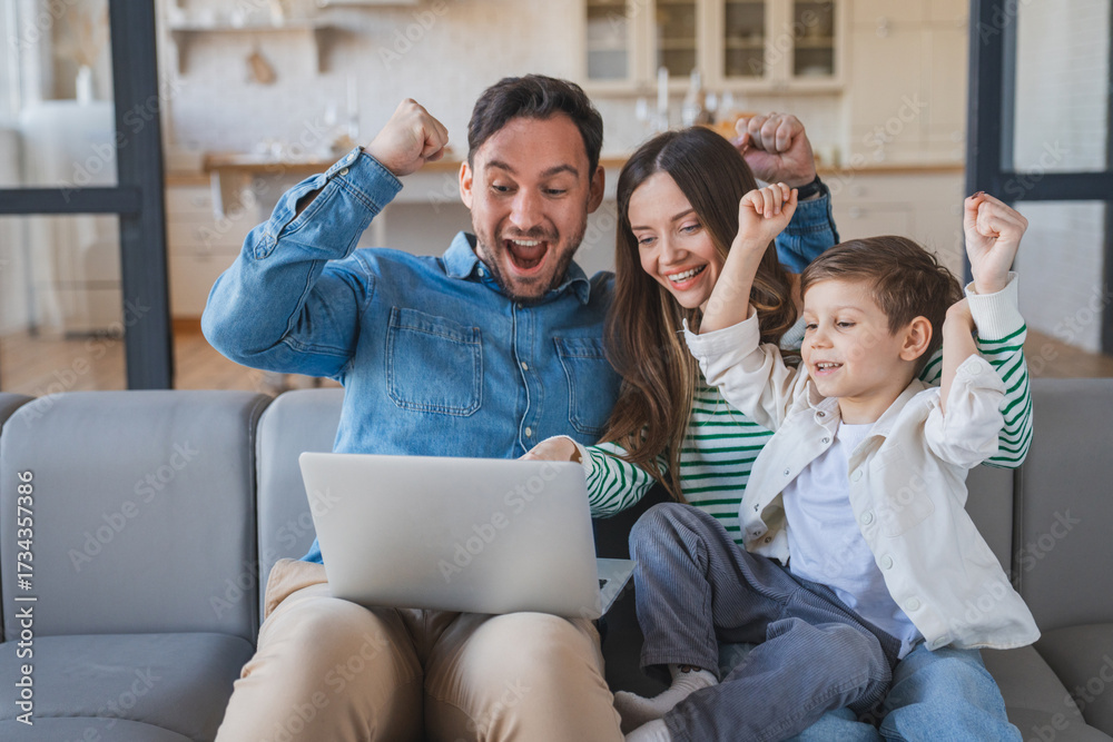 Success, laptop and happy family with credit card for online shopping, discount and sale. Bonus points, ecommerce and Caucasian people on fintech app in home with rewards, voucher code and savings
