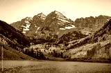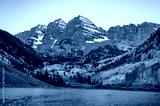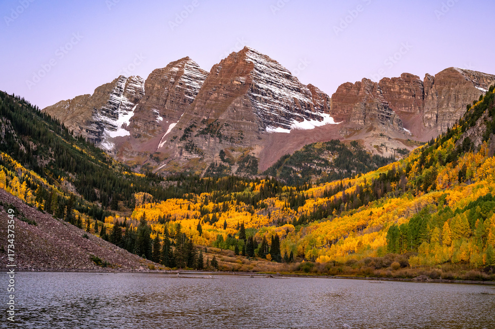 Maroon Bells at dawn. Bell-shaped peaks in the Elk mountains with yellow aspen forest over the lake. Famous autumn landscape during fall foliage in Colorado, USA
