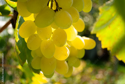 Picture of ripe white grape branch on blurred colorful bokeh. Green living and eco-friendly products. The concept of agriculture, healthy eating, organic food