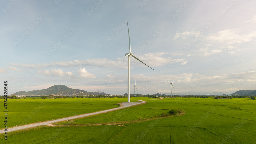 Green rice fields with wind turbines in rural Vietnam. Royalty high-quality free best stock of renewable energy and farming landscape, sustainable electricity, eco power, nature and environment