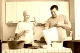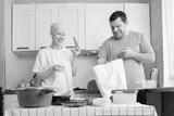Smiling couple unpacking groceries and preparing vegetables in kitchen with cancer patient