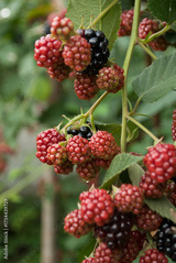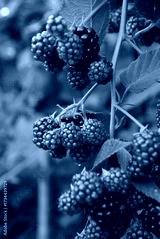 Black ripe blackberries in sunlight during harvest season. Blurred garden background. The concept of agriculture, healthy eating, organic food
