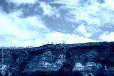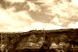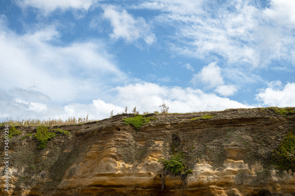 Coastal cliff of Santa Barbara Beach in the Azores with visible geological strata and vegetation growing on its slopes