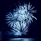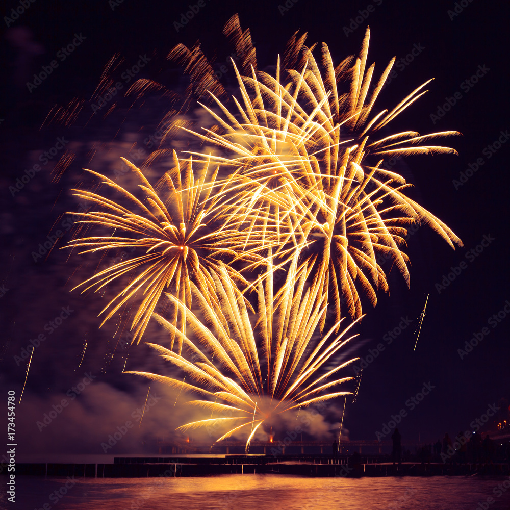 beautiful Golden fireworks over the sea on night sky background