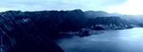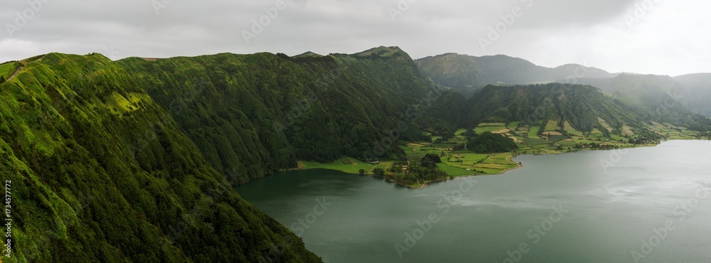 Panoramic view of beautiful lakes, volcanic craters and lush vegetation visible at Miradouro das Cumeeiras on the island of Sao Miguel in the Azores