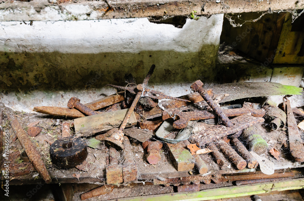 Rusty tools and bolts covered with cobwebs in an abandonded workshop