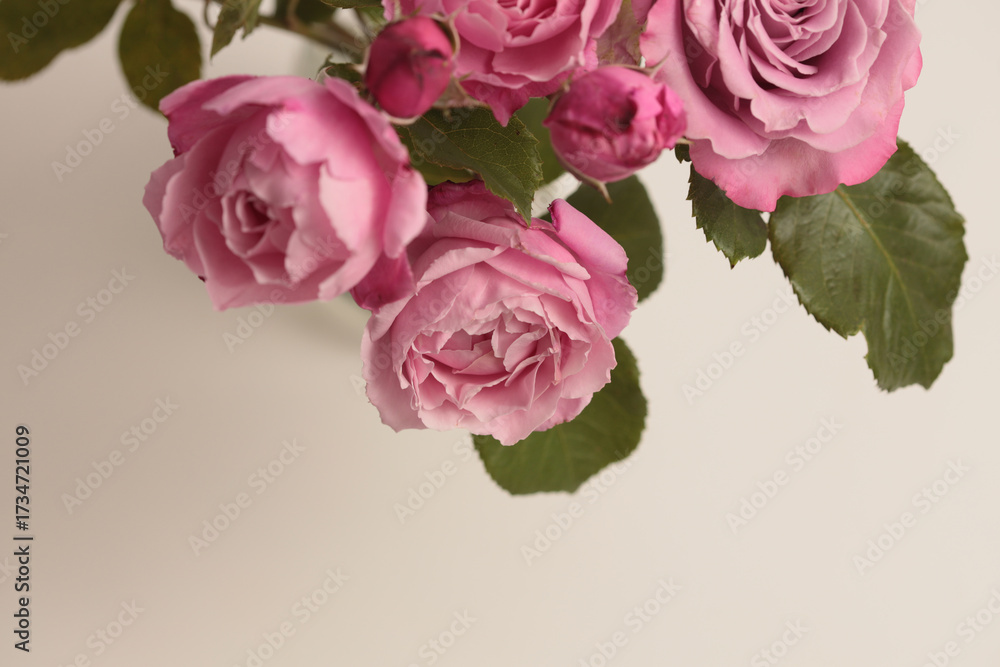 Selective soft focuscream pink cream Rose Flower bud petal, leaf bouquet on beige. Natural blur background.