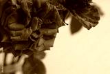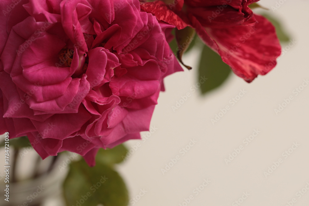 Selective soft focus close-up red, pink Rose Flower bud petal, leaf bouquet on beige. Natural blur background.