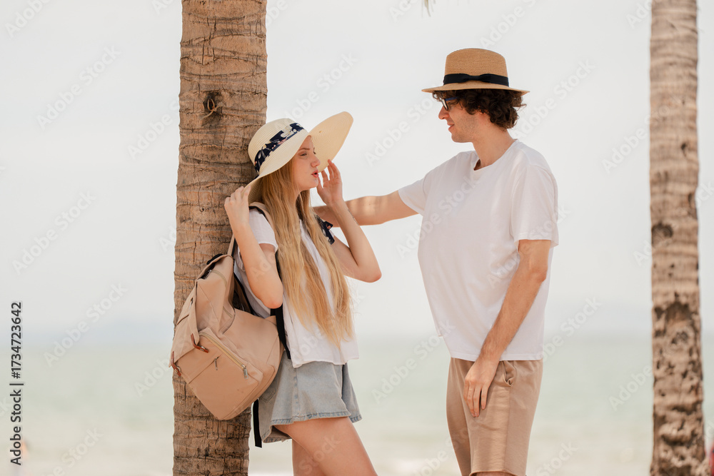 Romantic couple holding hands on tropical beach, enjoying summer vacation with sunlight and sea background, perfect for travel, honeymoon, love, and lifestyle concepts.