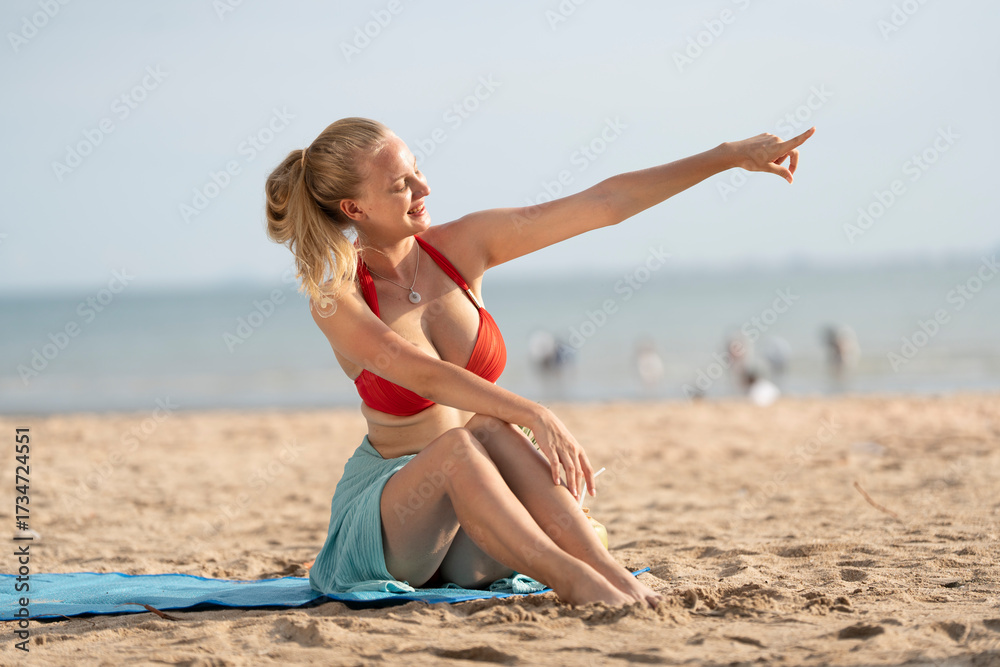 Smiling young woman in red bikini top sitting on towel at tropical beach, shading eyes from sunlight while looking out to sea. Enjoying summer vacation and peaceful oceanfront atmosphere.