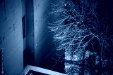 A moody, high-angle black and white view of snow-covered tree branches in a dark urban alley. A graphic and atmospheric winter scene with high contrast and abstract quality.