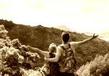 Child and his father hiking, family outdoor pursuit together exploring nature feeling free bonding