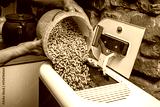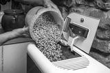 Close-up of a man filling biomass boiler or stove with wood pellets for home heating.