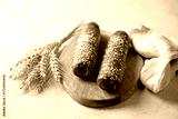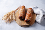 hot dog pretzel sausages on the wood cut board