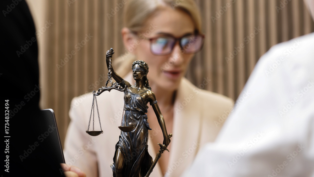 A married couple and a lawyer discuss family legal matters at a table in a modern office. A statue of justice is on the table. Concept of family rights protection and justice.