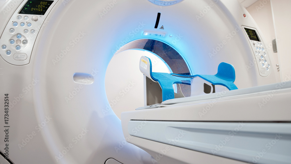 Contrast agent and CT scanner before diagnostics in the room. The concept of using modern technologies for accurate vascular examinations and disease diagnostics.