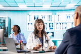 Old healthcare professional sharing medical expertise with senior man in office, discussing about x ray scans results and focusing on disease recovery plan. Diagnostic report in a meeting.