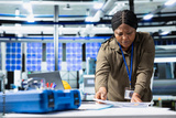 Female master engineer performing quality control on solar power production, showcasing cheaper renewable energy with infrastructure development. Industrial engineering in solar plant.