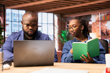 African american couple work on a management project for freelancing, using a laptop to research business trends and manage an online brand. Successful remote career development.