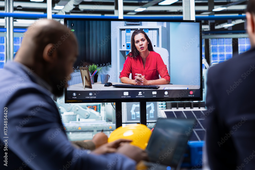 Factory manager doing online videocall meeting with investors to showcase manufacturing strategies. Executives doing teleconference with shareholders to show report of production growth opportunities