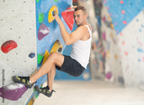 Sporty man in doing a difficult wall climb in climbing gym without special climbing equipment