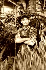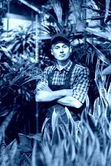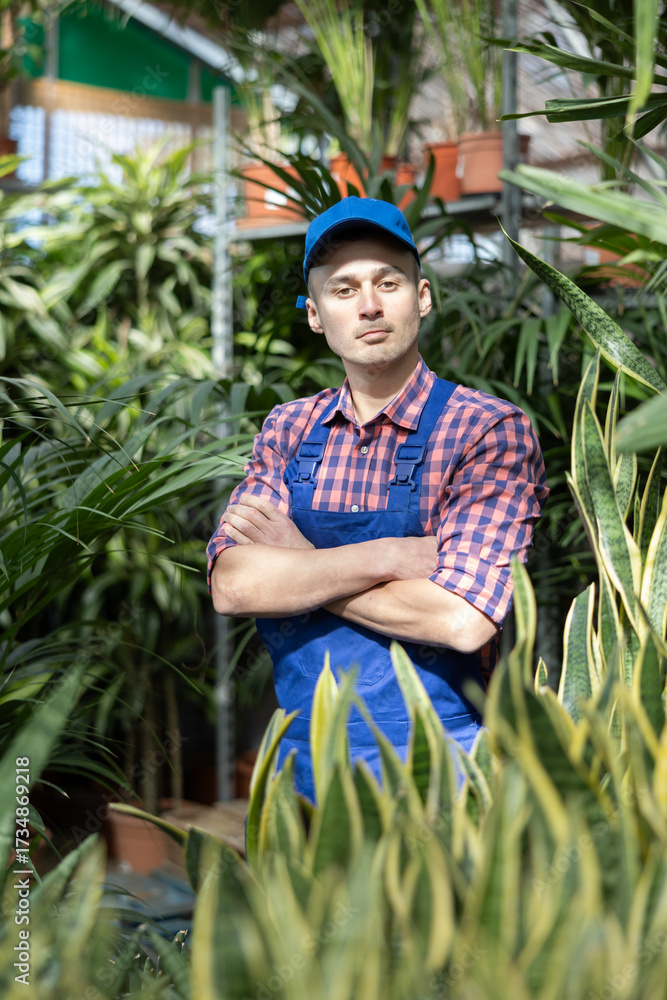 Male flower shop worker changes arrangement of pots with Sanseviera and improves appearance of window. Merchandiser man inspects showcase with decorative indoor plants in supermarket