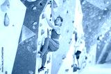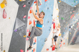 Young sporty woman training at bouldering gym without special climbing equipment