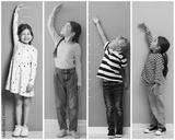 Cute children measuring their heights near colorful walls, collage of portraits