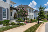 Residential white and light blue houses with trees, grass, and flowers in front, under a partly sunny sky. A sidewalk is lined with flowers and trees.