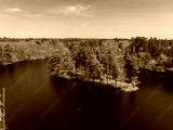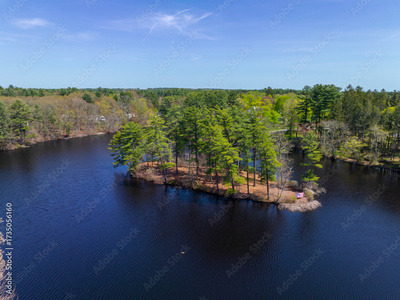 Johnson Pond aerial view on Forge River in spring at the historic center of Raynham, Bristol County, Massachusetts MA, USA.