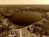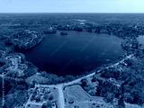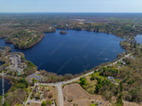Watson Pond and Lake Sabbatia aerial view in spring in Watson Pond State Park in city of Taunton, Bristol County, Massachusetts MA, USA.