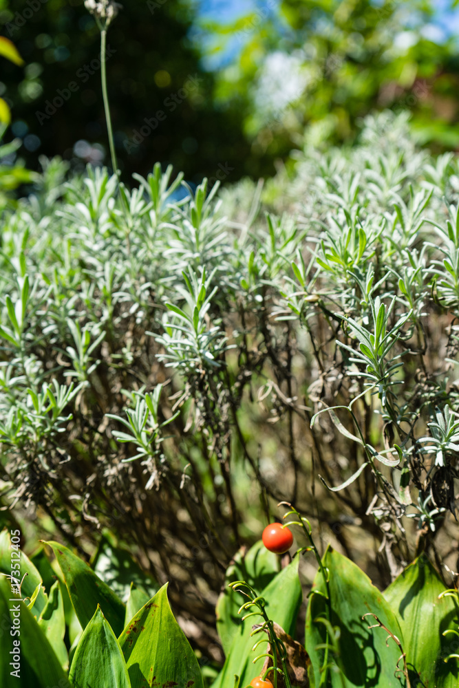 single tomato hanging from plant in front of rosmarin herb plant