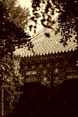 Intricate, golden details adorn a traditional Beijing building featuring layered, curved roofs and ornate patterns against a vibrant blue sky, showcasing rich Chinese architectural heritage.