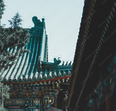 Intricate, golden details adorn a traditional Beijing building, showcasing ornate patterns and textures against a clear sky, exemplifying ancient Chinese architecture.
