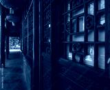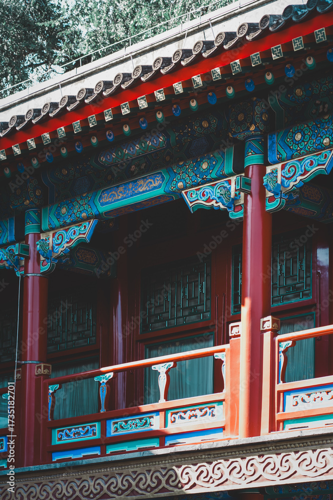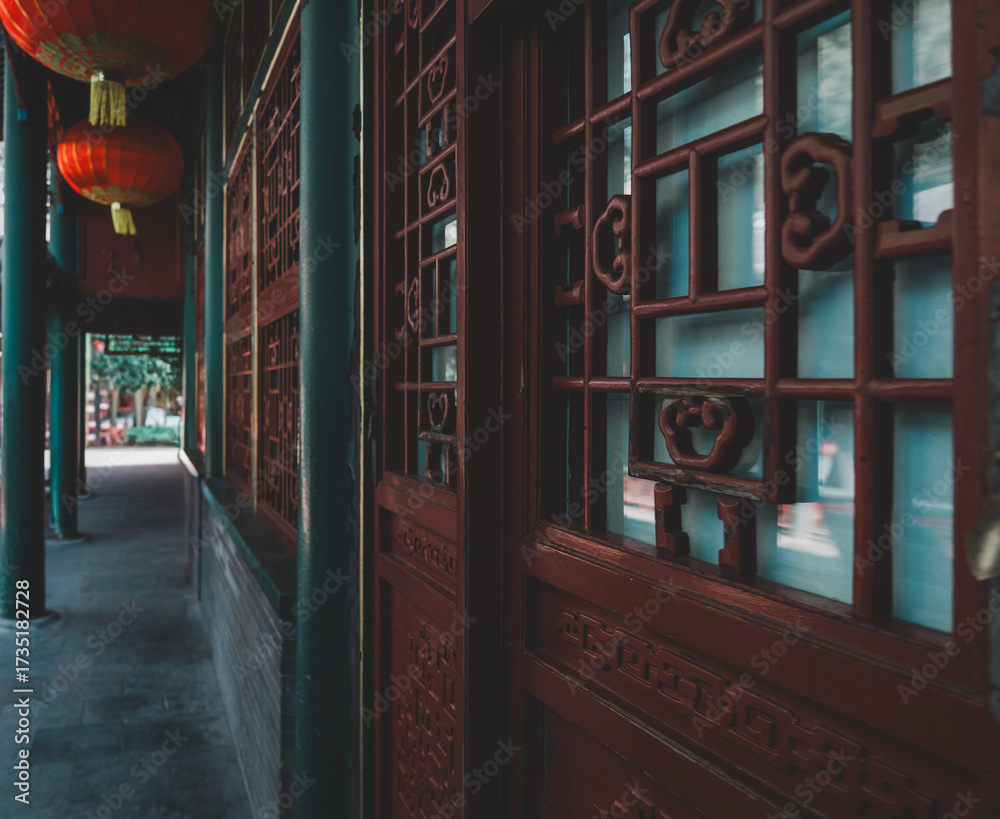 Intricate, ornate wooden latticework adorns a traditional Beijing structure, showcasing symmetrical patterns and a warm, aged wood texture against a subtly overcast sky.