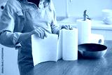 Young woman with rolls of paper towels and frying pan near table in kitchen, closeup
