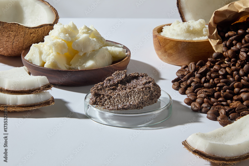 Close-up of coconuts, roasted coffee beans, and skincare butter bowl. Perfect detailed photo for cosmetic advertising and natural beauty branding.
