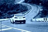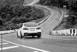 Luxury white car driving fast on a wet, winding mountain road after the rain. Dynamic travel and road trip concept through lush green tropical forest.