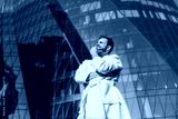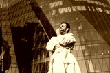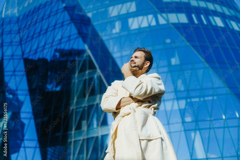 Playful businessman in bathrobe standing proud near modern corporate tower