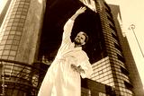 Happy man in bathrobe stretching outdoors near skyscraper on sunny day