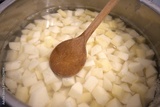 Cubes of raw potato in water inside a cooking pan. Close-up image of homemade preparation for cooking.