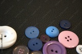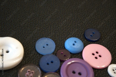 Assorted multi colored clothing buttons scattered on black leather background. Concept for sewing, tailoring, or fashion design.