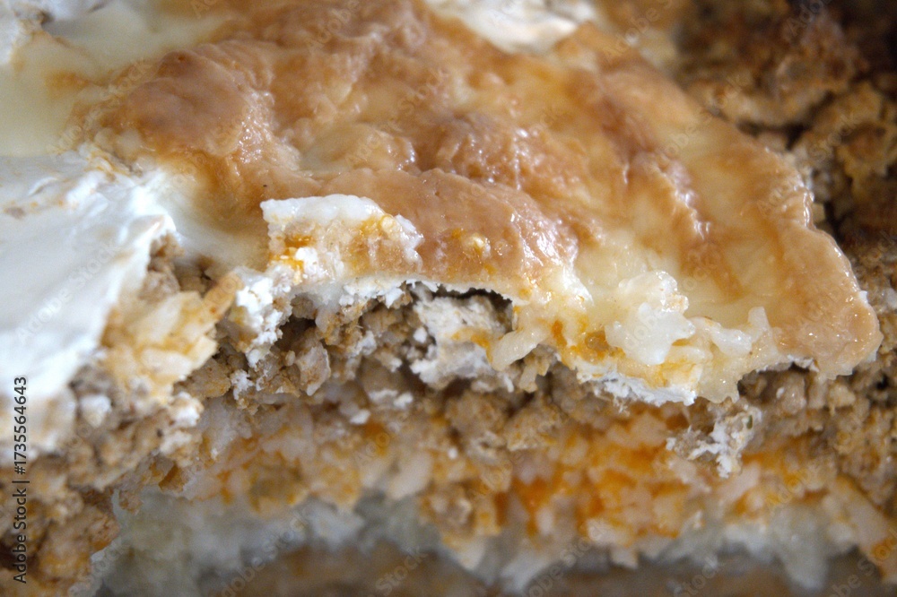 Freshly baked homemade cauliflower casserole in a baking tray. Close-up detail of traditional comfort food.