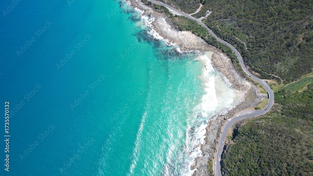 Coastal road on the beautiful ocean coast of Australia. Blue sea and beautiful beaches view from above.