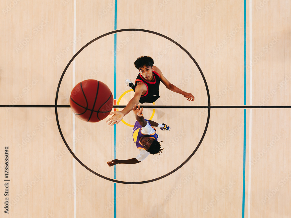 Basketball players competing for the ball