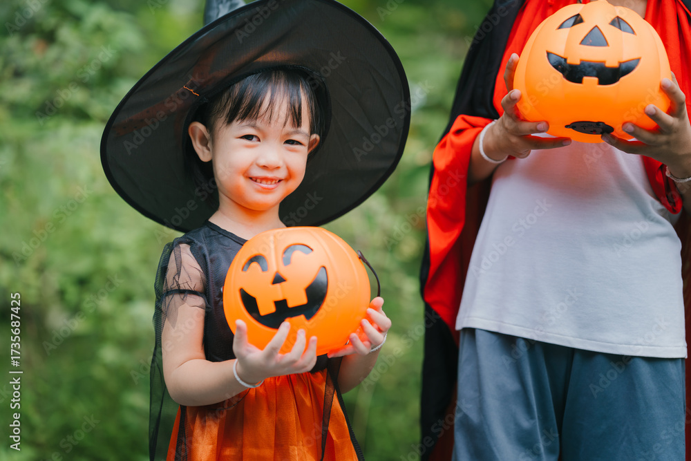 Two young children in Halloween costumes stand outdoors, holding pumpkin buckets with jack-o’-lantern faces. Wearing witch hats festive outfits, they share playful smiles, surrounded by lush green